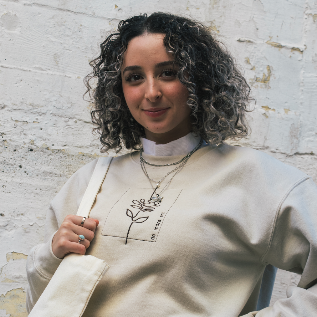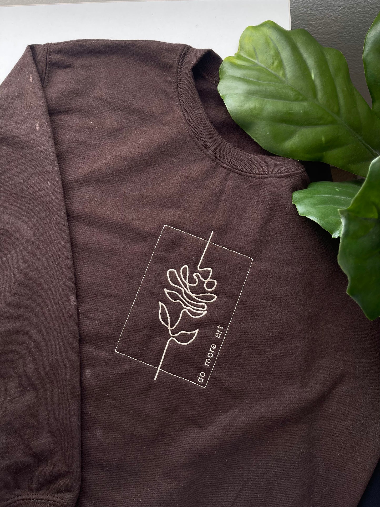 This embroidered design was inspired by a creative block I recently faced as I was sketching up a new design for this very sweatshirt! It hit me that it doesn't matter what you create as long as you do it creatively and it brings you joy. And alas, the "do more art" design was born!